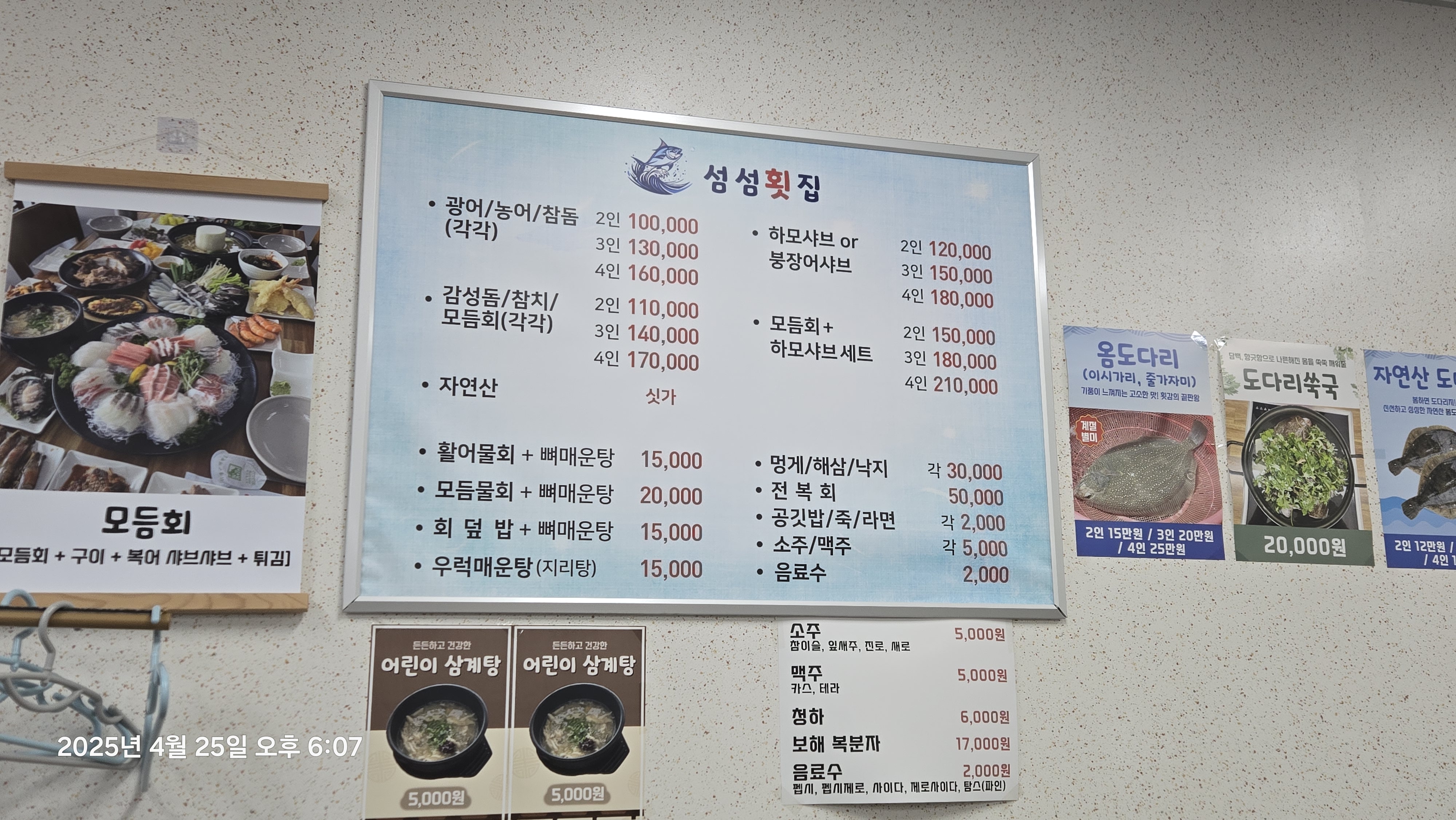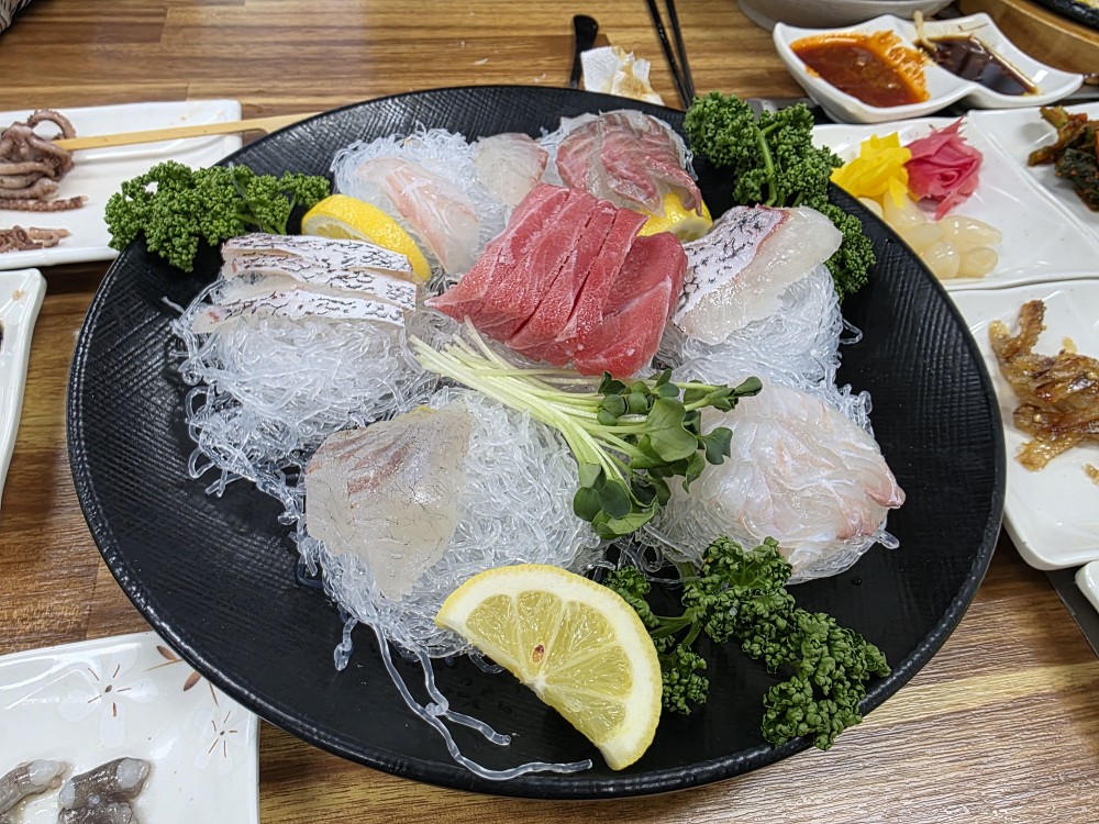 섬섬횟집에는 흔히 먹을 수 없는 고급 어종이 많았는데 줄가자미(이시가리), 강섬돔, 돌돔, 참치 등이 있었고 저희는 모듬회 2인 11만원짜리를 주문했습니다.