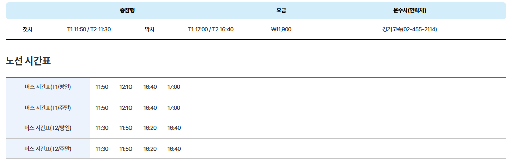 | 1 | 인천공항 T2 | 인천공항 세부 정류장은 아래 사진을 참조 하세요 |