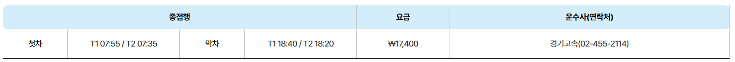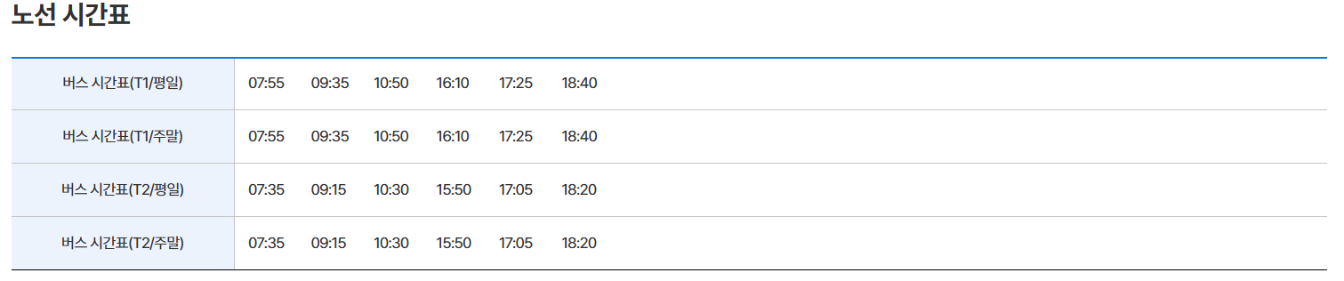 | 1 | 인천공항 T2 | 인천공항 세부 정류장은 아래 사진을 참조 하세요 |