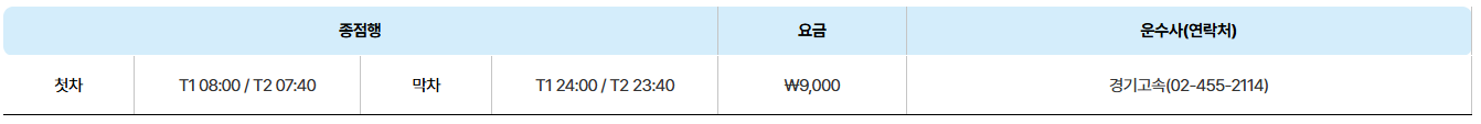| 1 | 인천공항 T2 | 인천공항 세부 정류장은 아래 사진을 참조 하세요 |