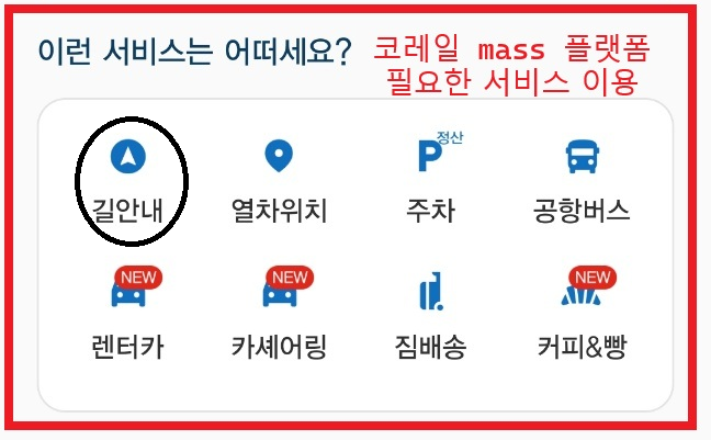 💡 팁: 코레일 mass는 기존 코레일톡 어플 내 맛집, 교통 등 다른 플랫폼을 연계할 수 있도록 만들어 놓은 것임.